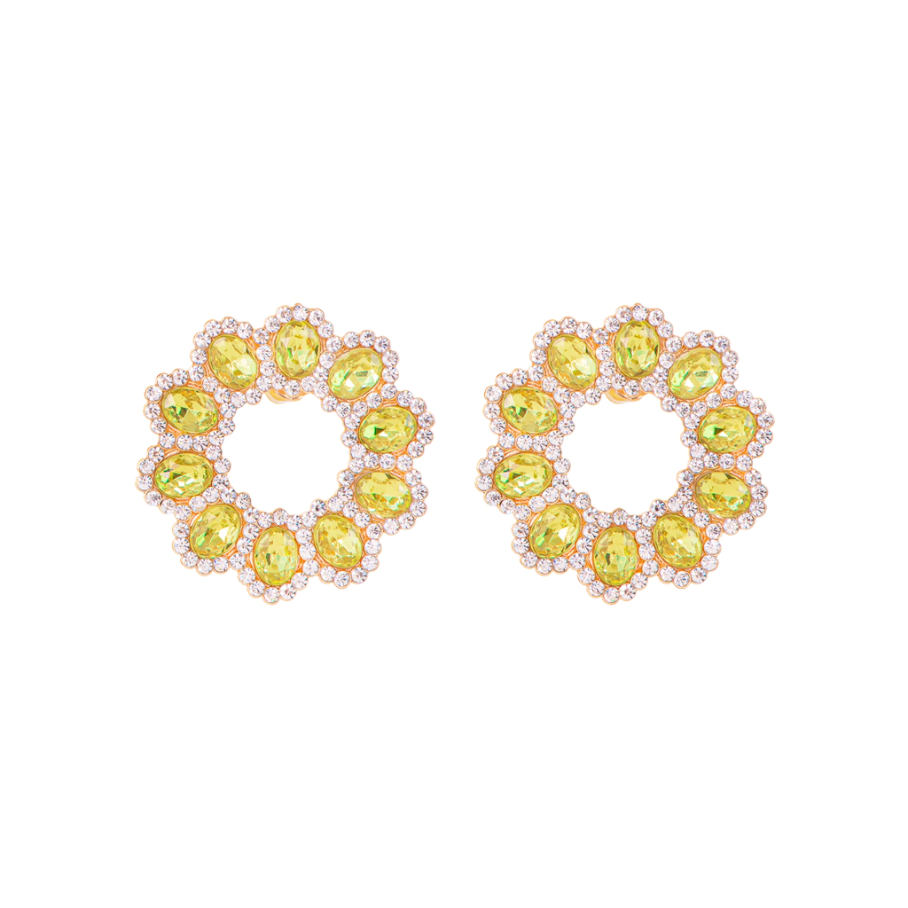 Brinco redondo cravejado com 10 pedras ovais, formando um delicado desenho de flor.