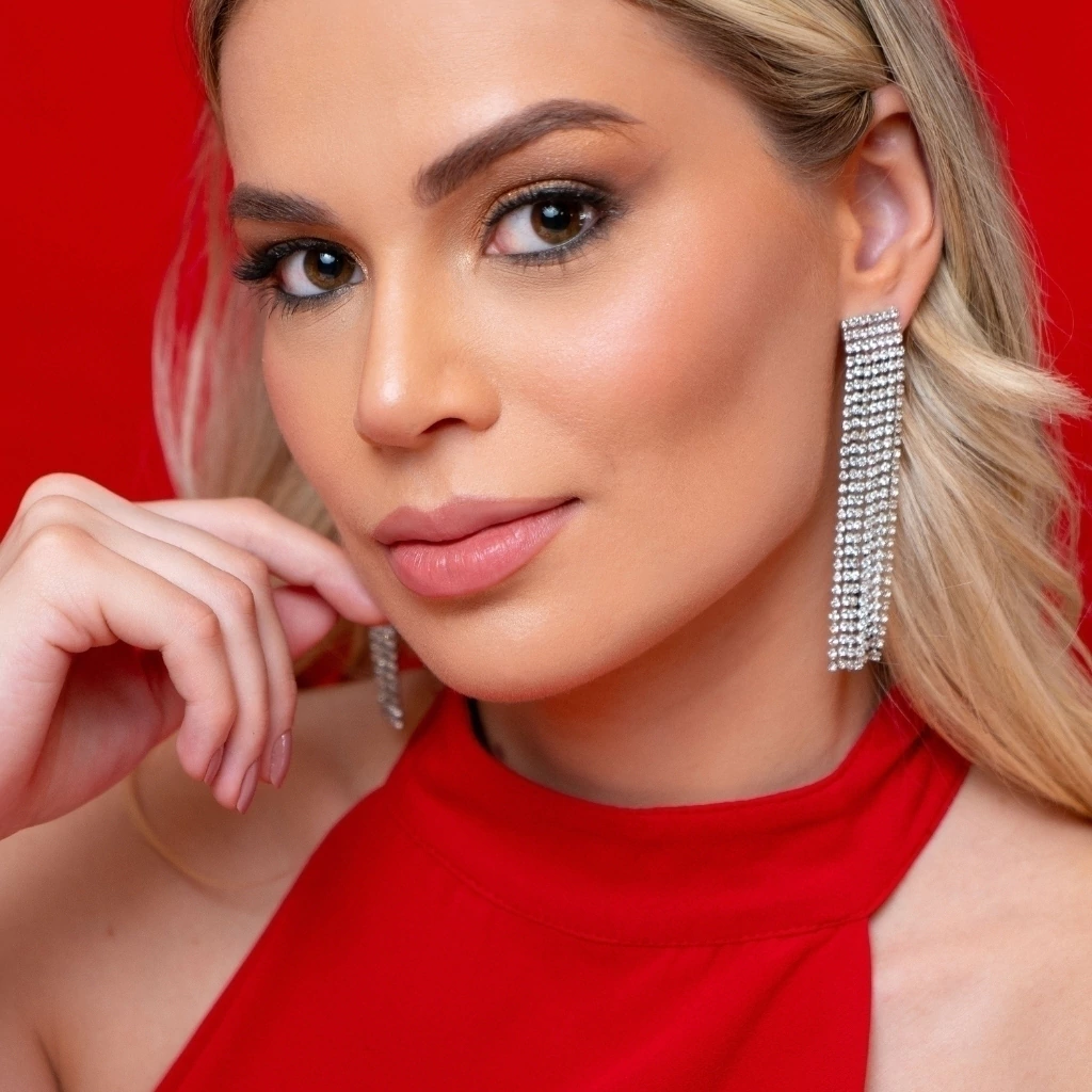 Este brinco possui um design quadrado cuidadosamente trabalhado, com cristais de strass que proporcionam um brilho intenso.