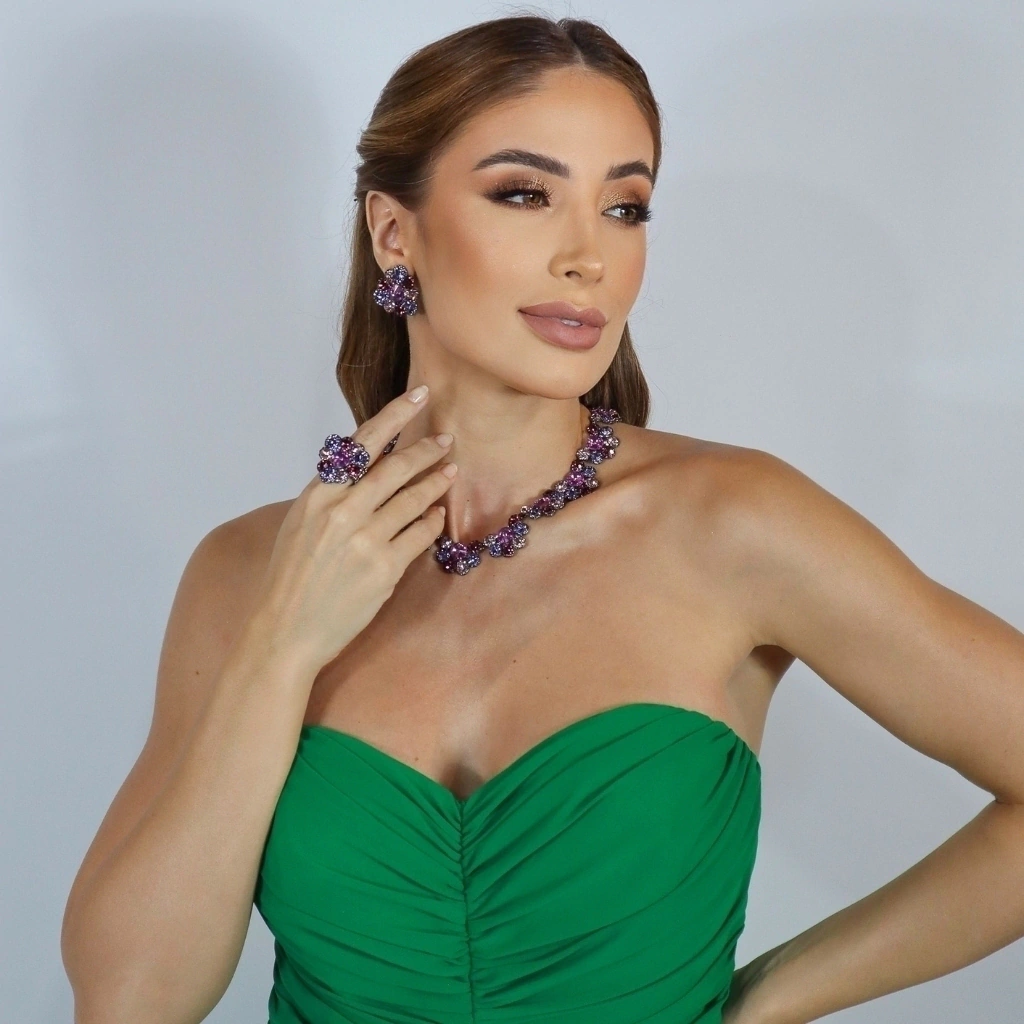 Descubra a beleza deslumbrante do nosso conjunto brinco e anel cravejado em forma de flor. Com um mix de cristais que capturam a luz de maneira única, cada peça exala um brilho encantador.